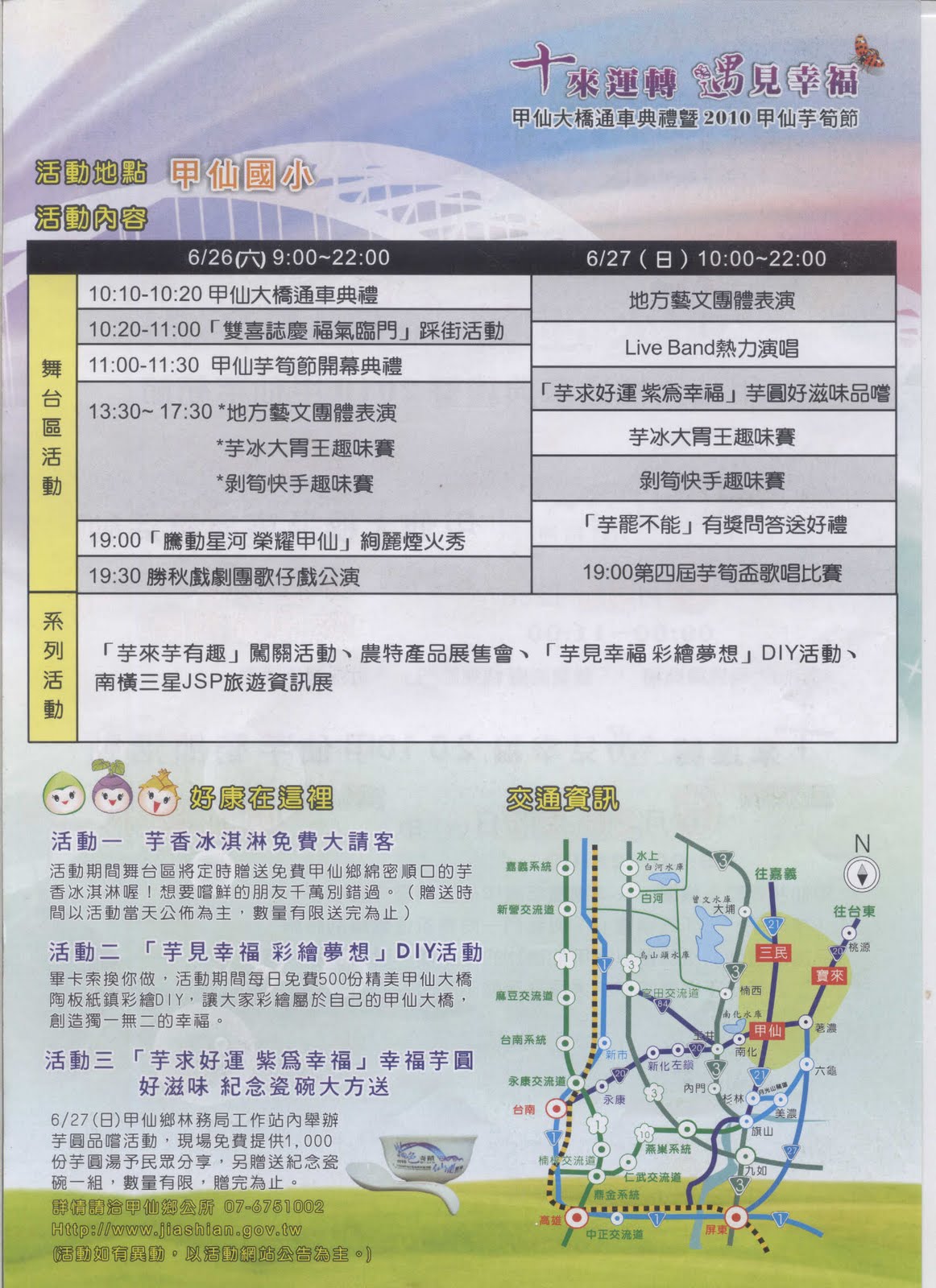 八八水災沖毀了許多橋樑,甲仙大橋也是其中之一,經過許多人的努力明天全新的甲仙大橋將舉行通車典禮,為了迎新甲仙人的期許與未來,工作人員仍努力不懈地做好自己的本分,希望所有人看見甲仙的美,也歡迎大家一起迎接第十屆的甲仙芋筍節,高雄縣政府及甲仙鄉公所用心策劃一系列的慶祝活動,還有許多甲仙的特產供大家品嚐,有關活動訊息歡迎上甲仙鄉公所網站查詢(http://www.jiashian.gov.tw/style/front001/bexfront.php)。