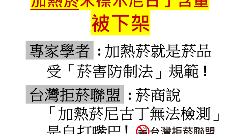 加熱菸未標示尼古丁含量遭下架 學者: 加熱菸就是菸品 受菸害防制法規範 菸商「加熱菸尼古丁無法檢測 」說法是自打嘴巴