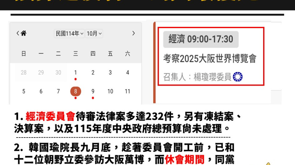 立院剛開議,經濟委員會擬赴大阪考察 公督盟呼籲楊瓊瓔委員別丟包上百件民生法案、預算案!