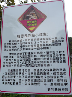 從山下一進入護蛙專區就可以看見路邊豎立大大的警告標誌,提醒開車的駕駛要多留心路面上的青蛙,路邊還設有梭德氏蛙的介紹看板,經由荒野保護協會的努力,大量減低梭德氏蛙Roadkill的數量。
