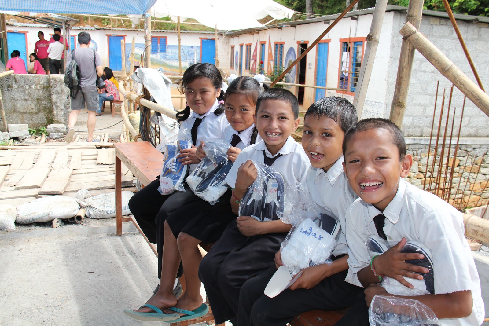 尼泊爾的孩子們開心的拿著鞋子合影