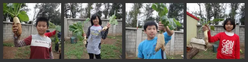 冬至隔天,五年級「扶老攜幼」、「攜家帶眷」、「全員出動」來到後方的「開心農場」,準備採收我們辛辛苦苦種了兩個多月的蘿蔔。看著原本小小的幼苗,成為白白胖胖的大蘿蔔。每個人都懷著既期待又怕受傷害的心,開心看到收成,但也怕蘿蔔長不夠大會被同學「比」下去。「嘿—咻!」「嘿—咻!」嗯!白白胖胖,真可愛!放到秤上一秤,喔買尬!竟然有十七公斤啊!