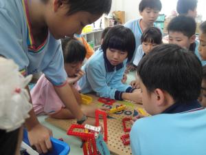 「機關王開課囉!」我們在自然教室進行教學。總共分成六隊,組裝的時候,有人很專心,有人卻各玩各的,我們在台上講解規則,台下像菜市場一樣,使出渾身解數,拜託他們安靜,但似乎一點效果也沒有,大聲喊「安靜」,過了五秒鐘,菜市場又出現了,學弟妹真像是從外星球來的不明生物,直到最後芷欣小記者用福義軒的餅乾獎勵最乖的小朋友,才終於看到效果。在各組練習過程中,雖然隔壁班老師來叫我們安靜的次數多如牛毛,但我們覺得學弟妹慢慢進步了!組裝的時候,有的小組很認真,有的小組漫不禁心,我們用不斷的加分和扣分來吸引他們的注意力,這時我們才發現,原來老師的工作是這麼辛苦呀!