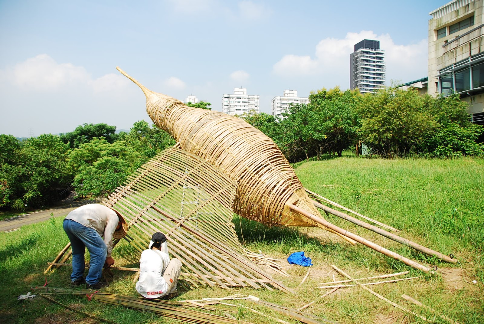 | 菲律賓藝術家羅傑‧堤彭和志工們合力完成竹編。 |