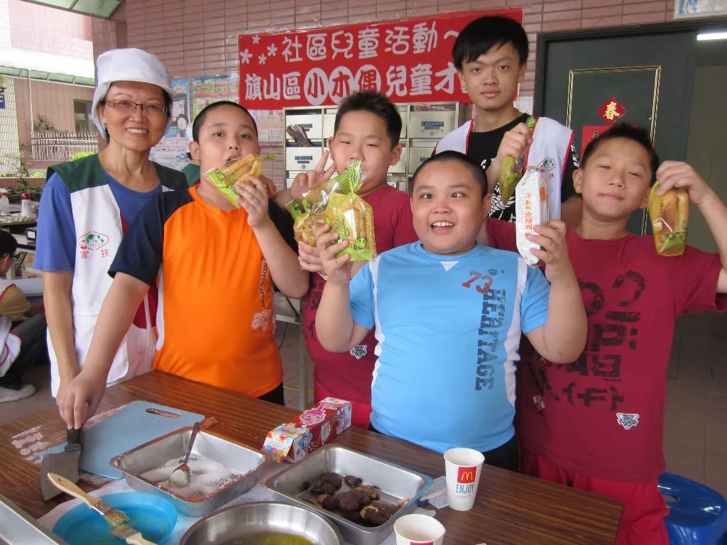 在這次用心規劃的課程中,特別邀請到家扶中心的自立家庭秀雲媽媽和郭月滿老師來擔任講師;秀雲媽媽和郭老師三年前就一同在旗山創立了強調絕不添加人工香料及色素的「阿爸ㄟ卡打車點心坊」;秀雲媽媽表示,除了想推廣健康飲食,更希望能回饋社會在過去對她和孩子們的溫馨扶持。連續兩個週末,在中心扶助之大專青年義工的協助下,秀雲媽媽和郭老師陪著孩子們嘗試自己動手做餅乾與奶油酥條,並藉此機會認識對身體有益的食品原料,大家一同度過歡樂、有趣的愉快星期六。