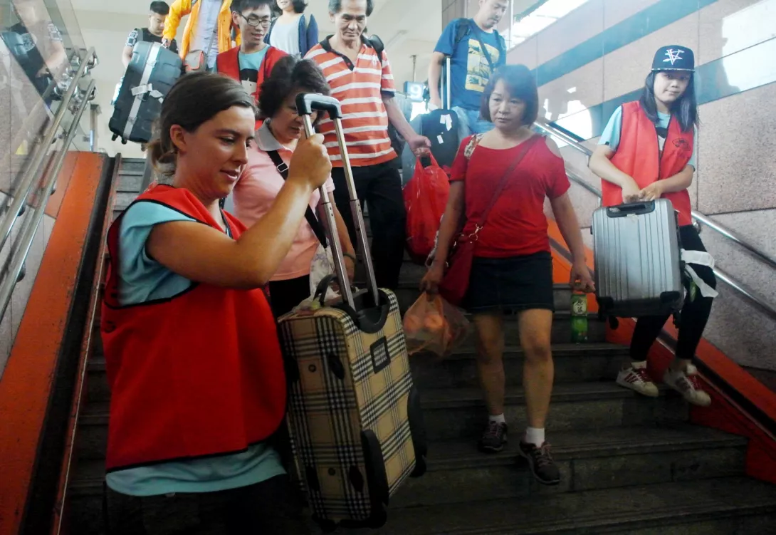一位七十多歲的伯伯,肩上背著行李,手上還提著大冰桶和器材,志工們立即上前接過行李,攙扶伯伯上樓梯,來自葡萄牙的Maria更讓伯伯挽住自己的手臂,一邊說著不標準的國語:「小心、小心」,直到伯伯找到車廂座位才安心離開,伯伯也對志工的幫忙覺得相當感謝。