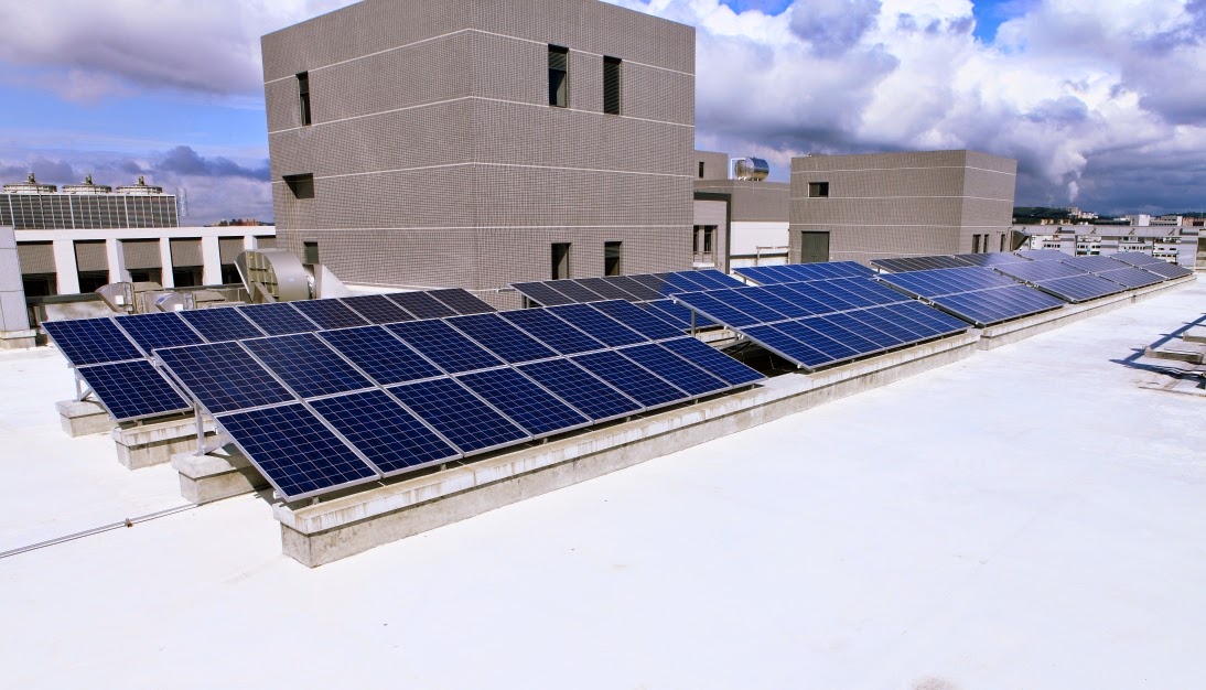 | 圖:在台達電子桃園研發中心的屋頂上,使用冷屋頂方式為建築物降溫,同時鋪上太陽光電板也有助於遮陽。 |