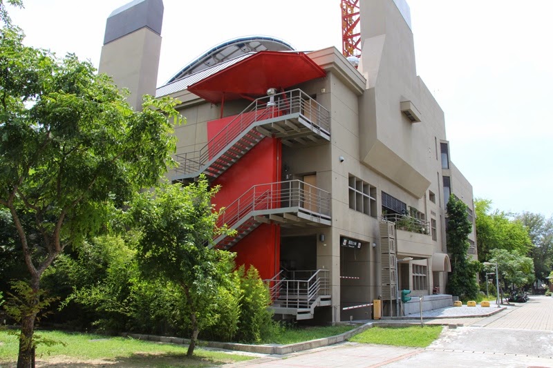 | 圖:成大孫運璿綠建築研究大樓後方的紅色雨撲滿漏斗,十分醒目。 |