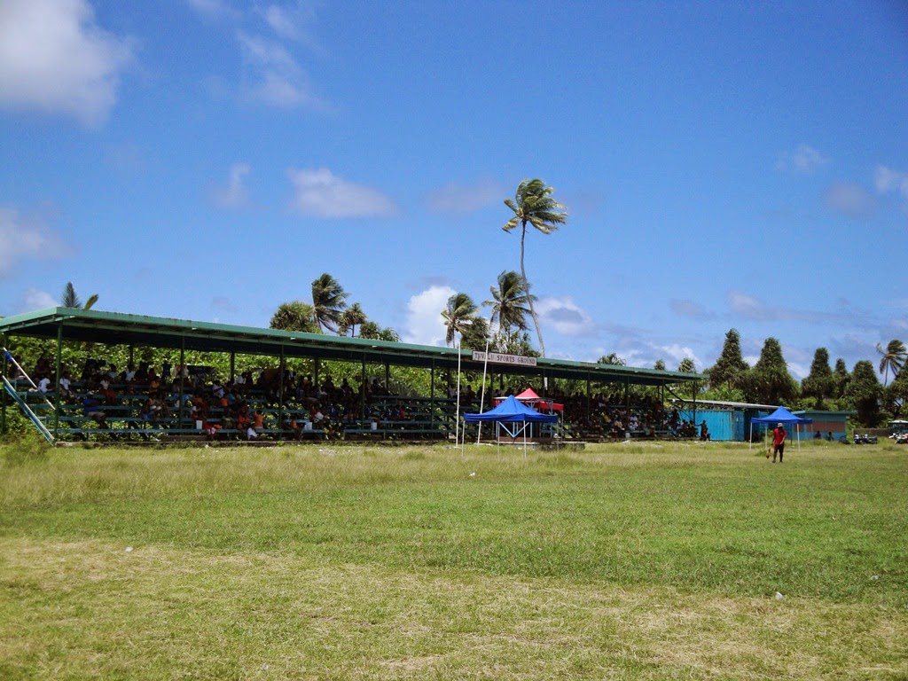 圖:藍天椰影下的吐瓦魯足球場,屋頂上鋪有太陽能板。(作者攝)