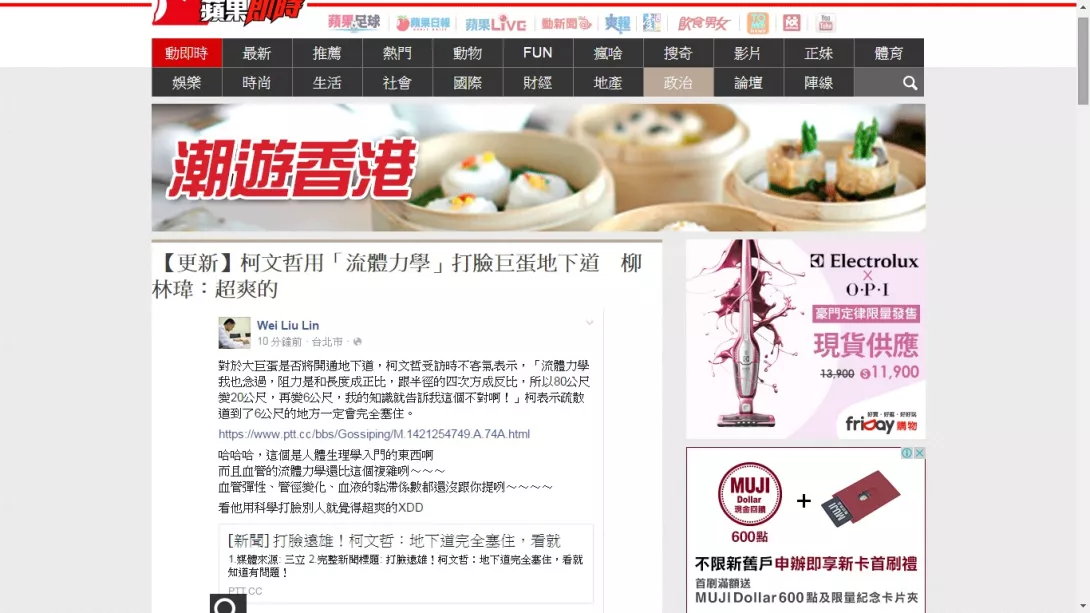看蘋果即時『【更新】柯文哲用「流體力學」打臉巨蛋地下道 柳林瑋:超爽的』 向沃草傳教士致敬