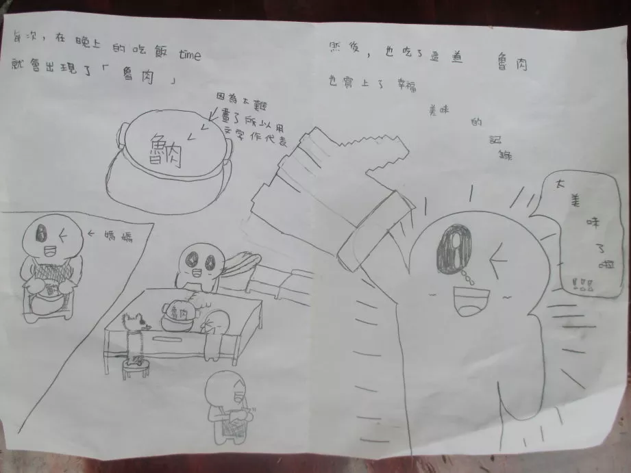 張婉庭則說交不出來,我想是不是又一次遲交作業,後來我問她:「搶救農地連署妳是第一個交,為什麼這次交不出來呢?」她說:「我不會表達感覺。」而郭子進畫出全家吃涮涮鍋的想像圖,一個字也沒有,他說:「我爸在國外工作,我媽工作到十一點才回來,最近都在阿嬤家吃飯。」劉承佑則畫沒有表情的三個人同桌吃飯,經過詢問引導,他才說:「每天晚上,我都可以與父母好好吃飯,這讓我覺得很ㄅㄧㄤˋ。」我暗自反省沒有考量到部份孩子沒有很多機會學習表達感覺。