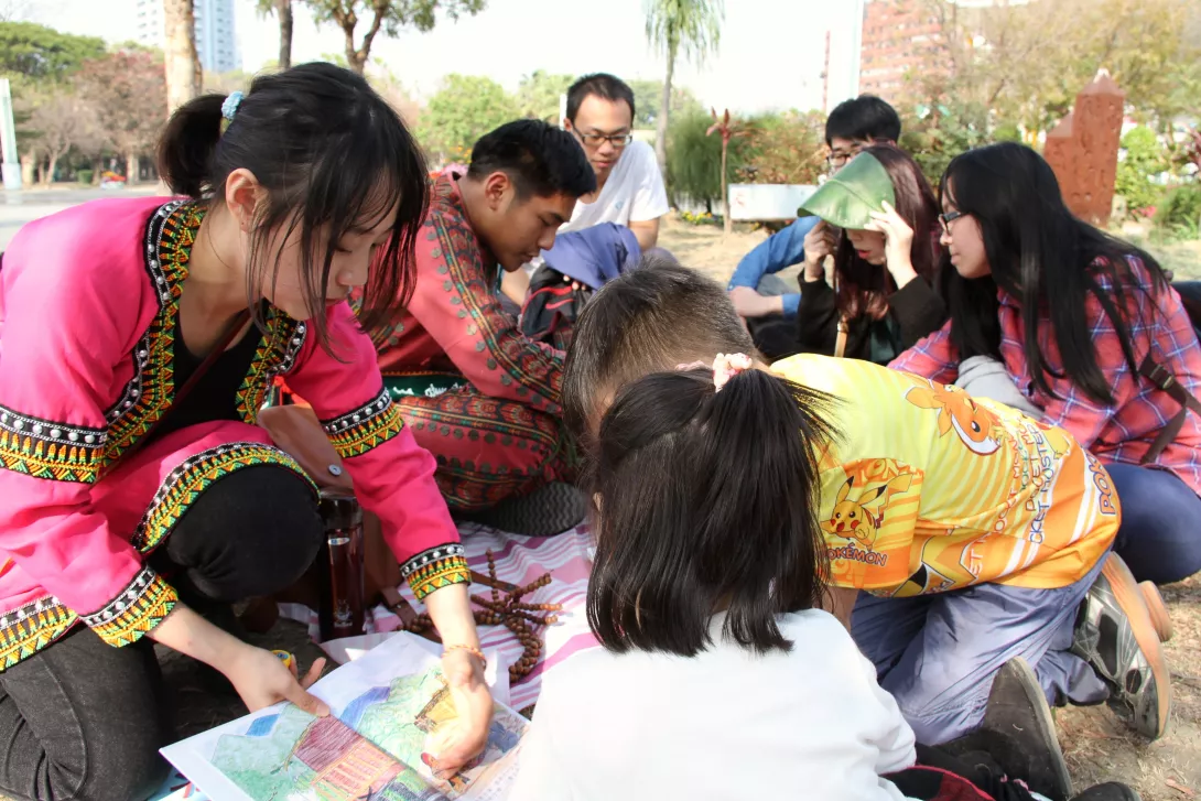 屏東縣三地門鄉安坡Djineljepan部落的青年學子,今天午時走出部落來到高雄市中央公園捷運車站前廣場,將山林間孩提時期童玩生活樂趣分享給都會區的朋友,藉由部落傳說故事及分設多項闖關遊戲活動來實際體驗原鄉之美。活動過程將以認識安坡部落故事為起站,搭配與榔共舞、竹蜻蜓、聲格格、草定情等闖關活動。現場報名參加人數踴躍,家長陪著幼齡孩童,在親子互動遊玩間嬉笑,對對情侶爭相學習"草定情"編織技藝,許多國外交換學生也加入翻譯行列,場面猶如大型國際嘉年華活動。
