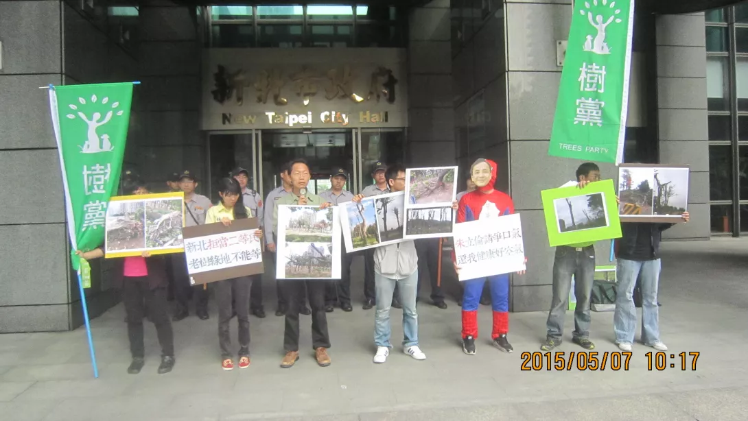 護樹團體等 朱立倫請留下老樹與綠地,為市民爭一口氣,爭口乾浄的好空氣 新北市人均綠地五都吊車尾記者會實錄20150507:http://youtu.be/lg6Pi0q_iL8(YouTube公益新聞頻道.完整影音報導)