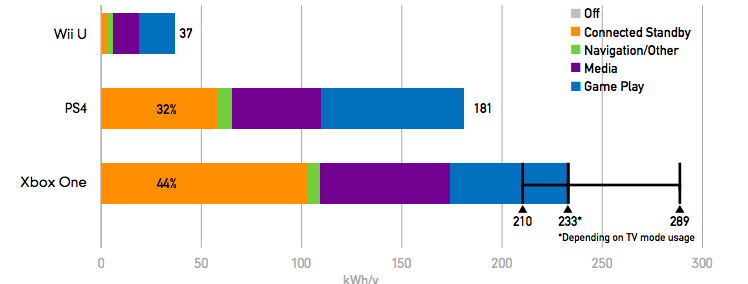 圖 > 美國環保團體 NRDC 在2014年製作的報告,顯示不同品牌機種「每年耗能量」, 其中也分別顯示他們在關閉(灰),待機(橙),上網/其他(綠),媒體播放(紫) 與打遊戲(藍)這些不同功能時的耗電。 |