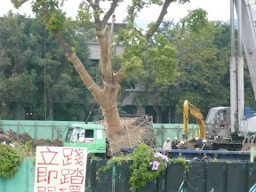 我們看到老樹被拔起,沒有連根,因為根都砍斷了