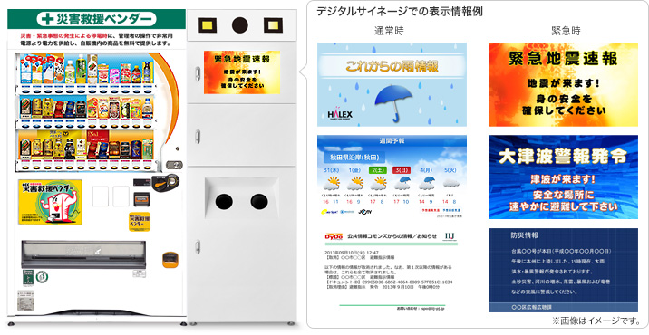 圖:緊急災難時,部分機器會充當公共資訊提供站,即時傳達海嘯、地震等通知與避難導引。(出處:Dydo自動販賣機網頁) |