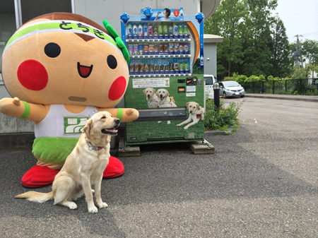 | 圖:栃木縣吉祥物とちまるくん身後的販賣機,是與各地導盲犬協會合作的環境募金機台,每筆消費會撥出1%以上給導盲犬的培訓之用。 (出處:とちまるくん部落格) |