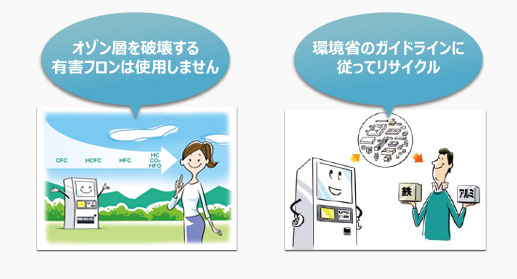圖:左邊是自動販賣機不使用破壞臭氧層的冷媒,右邊是依照環境省指導方針做好回收(來源:日本全國清涼飲料工業會) |