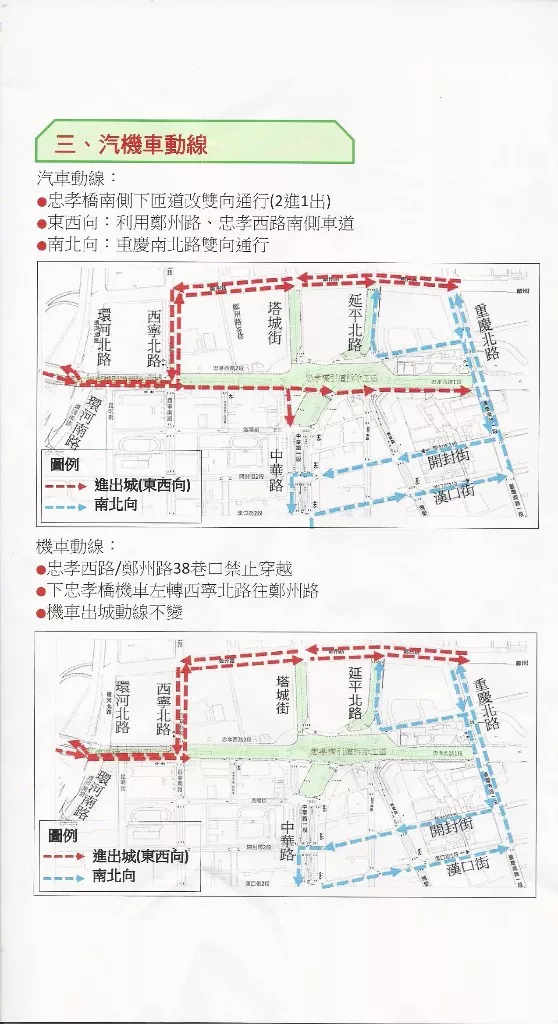 利用忠孝橋及忠孝西路進、出城雙向車道各減少1線車道,仍維持雙向3線車道通行,建議改道行駛市民大道、
