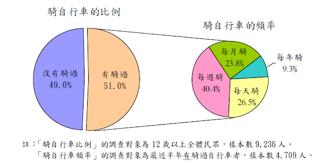 | 圖:2009年下半年12歲以上民眾騎乘自行車的比率與頻率 (出處:98年「自行車使用狀況調查」摘要分析/交通部統計處) |