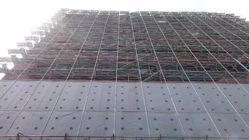 進入立法院採訪記得戴上安全帽,2016年08月29日濟南路上的群賢樓,及中興會館都在施工外牆,也架上鷹架。