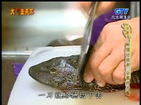 還有剛被腰斬的琵琶魚,主持人拿著圓睜雙眼、還在抽動的魚頭對準鏡頭,笑著展示魚那垂死前無言的控訴...。