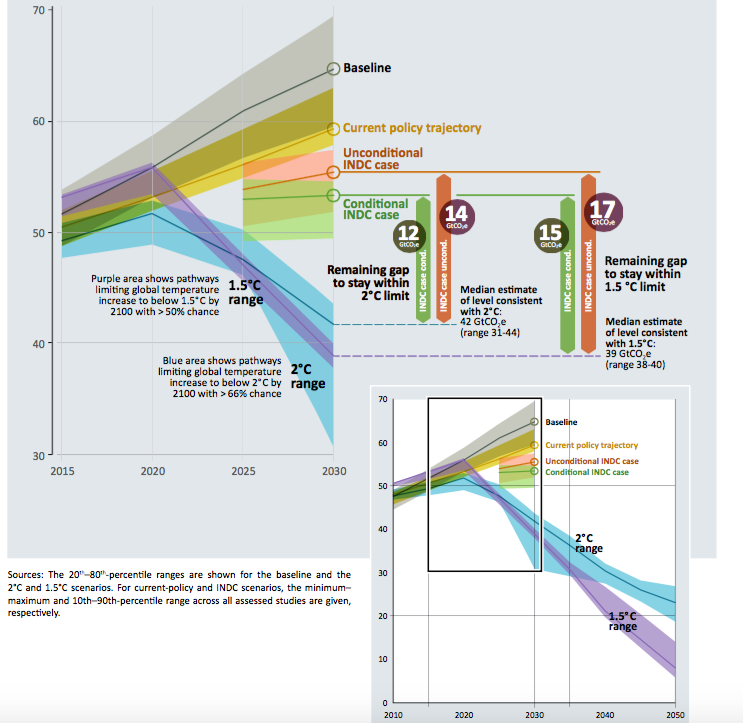 | Global greenhouse gas emissions under different scenarios and the emissions gap in 2030 (資料來源:The Emission Gap Report 2016) |