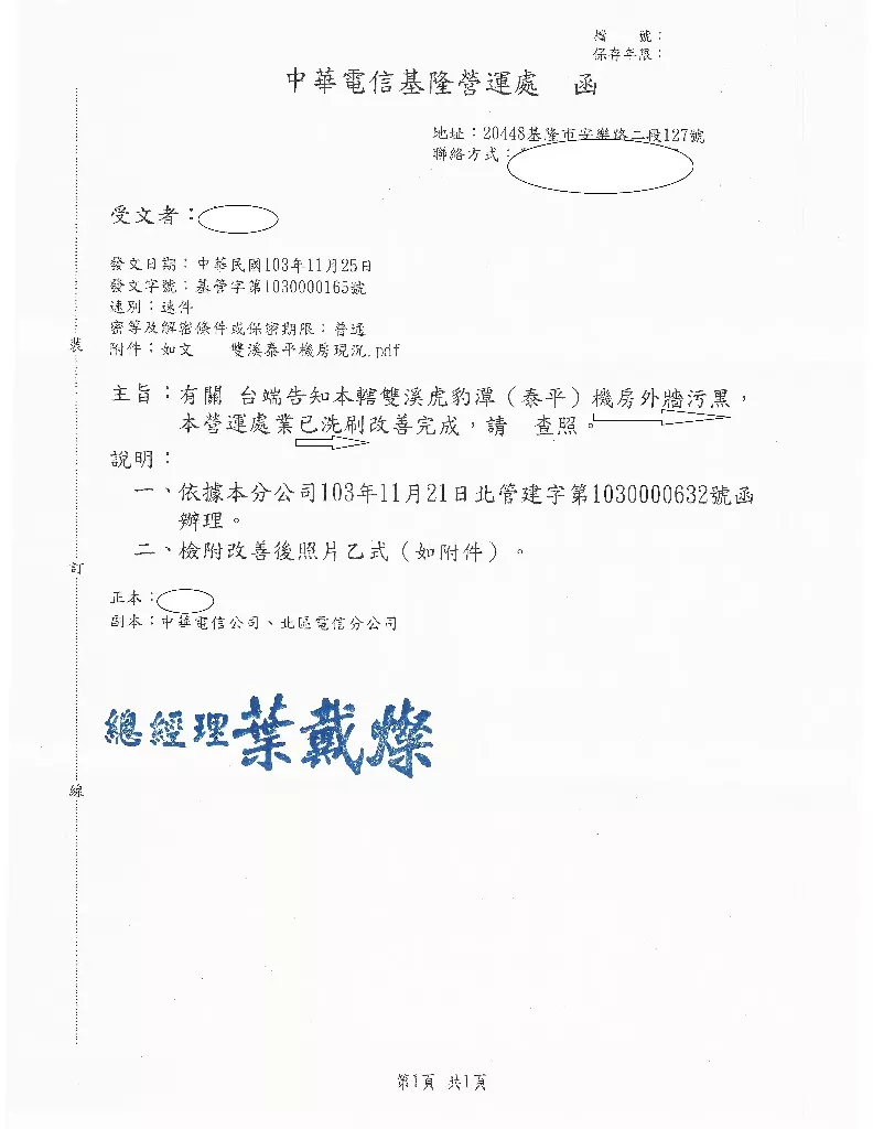 二、陳情內容1.「北市雙溪區泰平村當地民眾熱心公益,無償提供土地給中華電信建設機房使用,中華電信卻未善盡善良管理責任,任憑牆壁地板烏黑。」乙事,經查本分公司管理單位每年十月皆定期清洗該機房內外牆及鋤草,承蒙關注,謹申謝忱。