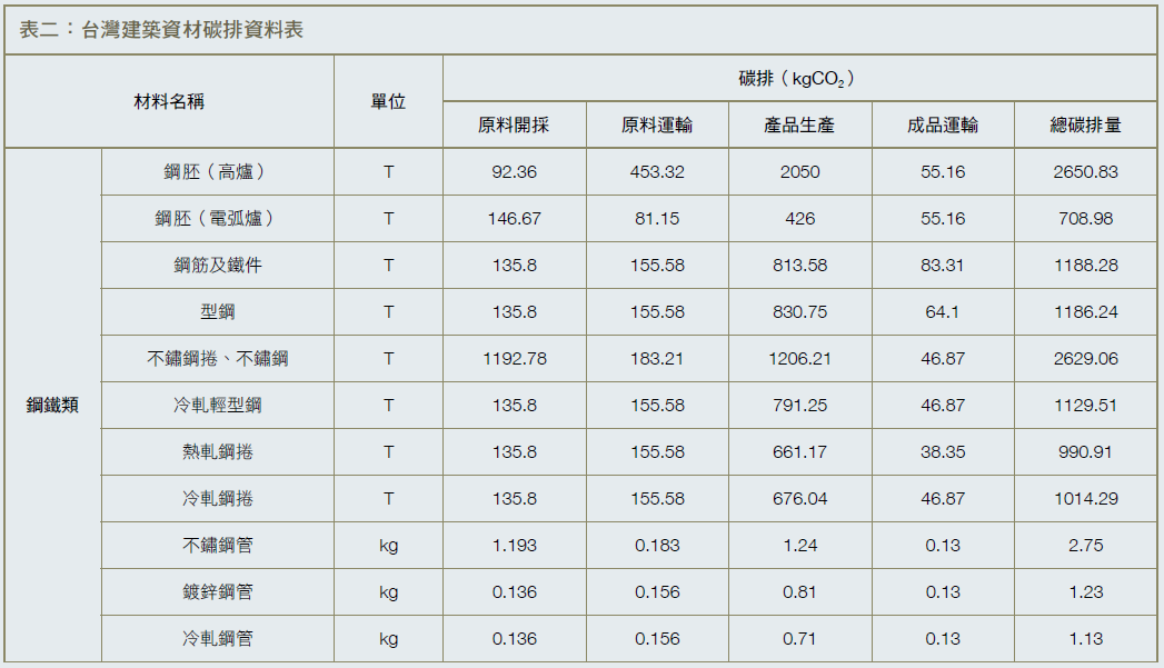 其次是建築材料的選擇,黃志弘解釋,每種建材都有不同的碳足跡密度,進口建材更是高昂碳足跡的大宗來源。比方說,進口粗鋁錠的碳排放量,是鋼筋的8.6倍,也是一般水泥的18.8倍;而高爐鋼胚與電弧爐鋼胚的排碳數據,更相差三倍以上。只要懂得選用愈多的環保建材或當地材料,對降低建築碳足跡便能起到立竿見影之效。(表二)