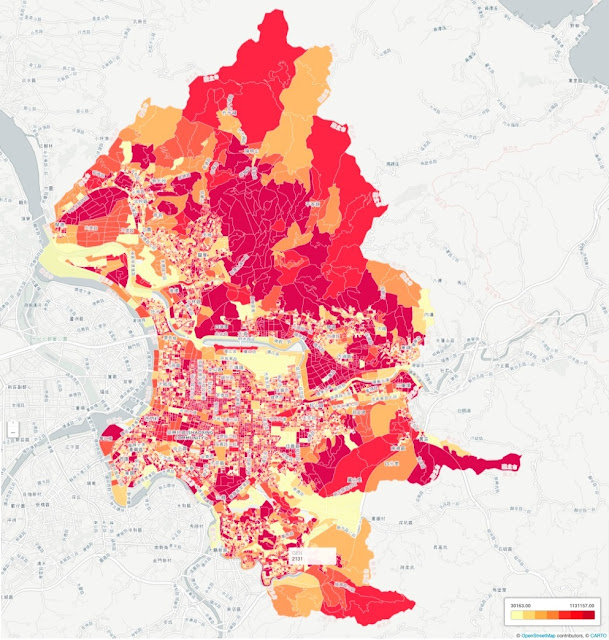 | 圖:地球公民與友團、台電及經濟部討論製作能源供需資料,此圖為「台北市非營業用戶用電量」,顏色越深的區域,代表用電量越多。( DSP智庫驅動團隊製作,資料來源) |