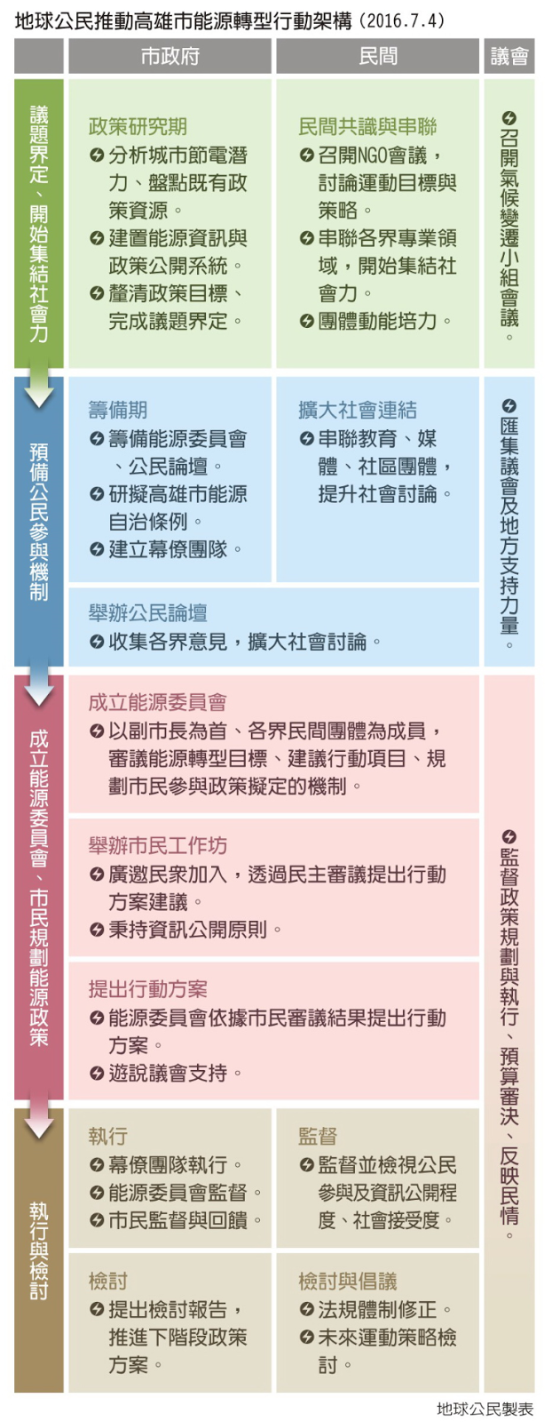 不久前,由許多NGO合組的「民間能源轉型推動聯盟」,曾對各縣市政府的能源治理能力進行評比。訪談高雄市時即發現,主管節電業務的經發局也有意推動能源轉型,但亟需民間單位協助。2016年初開始,經發局多次請益地球公民基金會、綠色公民行動聯盟、旗美社大等民間團體,但直到六月仍未見該局提出行動時程。對此,地球公民基金會主動提出高雄市能源轉型的行動架構(下表)。收下這份規劃後,透過工研院等專業單位的協助,經發局終於在2016年底完成初步計畫,羅列出:城市能源供需分析、節電計畫藍圖、能源自治條例架構等內容。