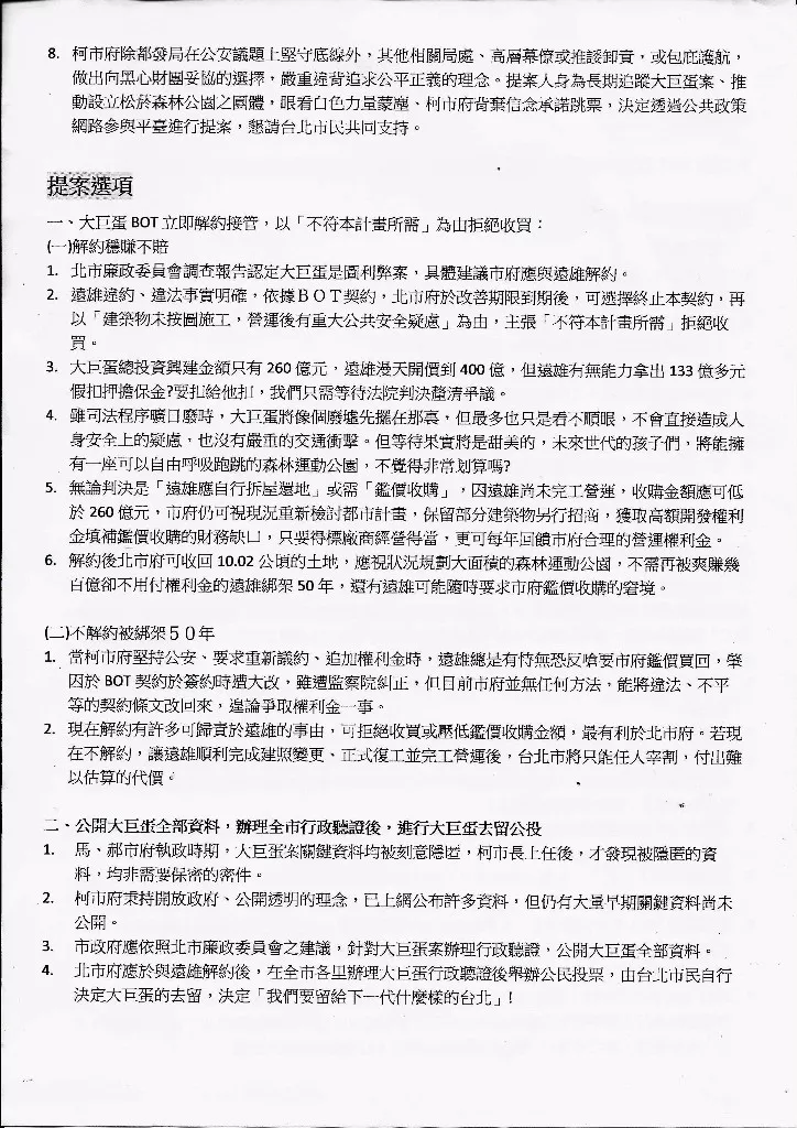 4. 北市府應於與遠雄解約後,在全市各里辦理大巨蛋行政聽證後舉辦公民投票,由台北市民自行決定大巨蛋的去留,決定「我們要留給下一代什麼樣的台北」!