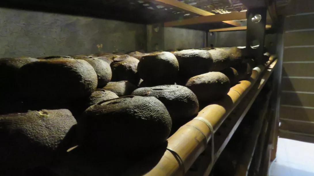 採摘→挑選→開孔取果肉去果仁製果帽→果肉混和膨風茶與中藥材→混和好的材料塞回果帽壓緊、捆綁→經九蒸九曬、燻 壓等手續約需120個工作天 。