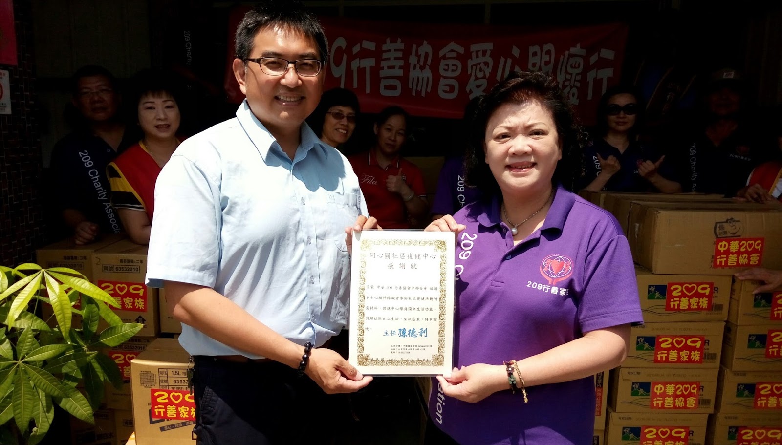 中華209行善協會8月21日參加物質捐贈雲林土庫「華聖啟能中心」、清水「同心圓慈精神復健中心」,志工包括李淑睿、謝靜芬、陳淮壽、鄭允全、虞金生、楊欣芳、陳松靖、李素連、王寶蓮、于郁金、葉姿君、陳長成、賴文琪、李柏慶、李寶珍、蘇進淵、陳建祥賢伉儷、鄭師兄賢伉儷等;儘管艷陽高照,揮汗如雨搬運物資,卻甘之如飴,大家都秉持著慈愛歡喜精神,發揮愛心,面帶微笑,行善助人!藉由此次捐贈活動,更讓受贈單位感受到「人間有愛、處處有溫情」社會,使本次活動更顯得有意義。