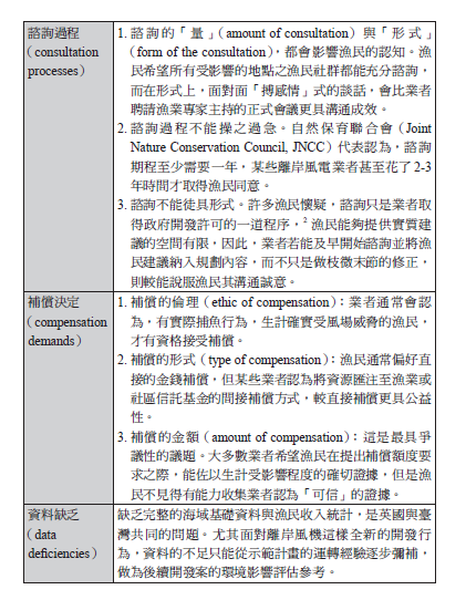 英國案例顯示,與離岸風機相關的民眾抗爭,通常源於業者與漁民間的不信任。由於離岸風機是無前例可循的開發行為,缺少具公信力評估基準,只能透過示範風場運轉經驗,逐步累積可供後續參考的基礎資料。在離岸風場對海洋生態與漁業經濟衝擊的程度還不確定的當下,業者與漁民的諮詢溝通必然費時費力,但考量風場未來穩定經營及國家再生能源長遠發展,這是必要付出的工作。