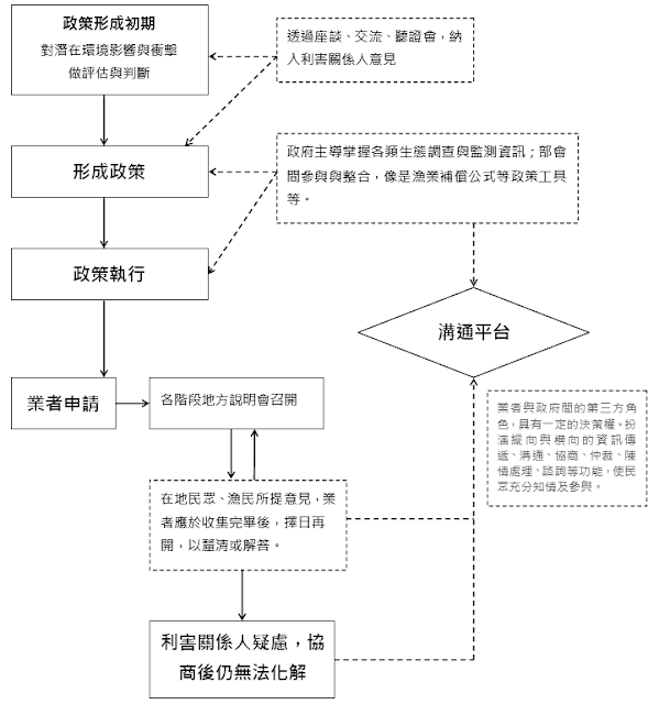 第Haggett(2008)研究指出,增加再生能源決策過程的民主、社會信任與公平性,有助離岸風場順利建造;英國風能協會也建議,業者不能只是單純公告開發案內容,還要積極告知開發行為隱含的環境效益與成本,讓各類利害關係人及早參與規劃與補償協商過程。從英國相關案例整理,我們提出臺灣離岸風力發電爭議與化解機制初步構想,這套流程圖的核心原則是從規劃初期就納入民眾意見,透過座談、說明會或聽證會雙向溝通,並針對會中提出質疑進行調查,若有實質影響則據以修正規劃內容,或搭配其他政策工具如漁業補償公式,降低離岸風電開發的環境與社會經濟成本。