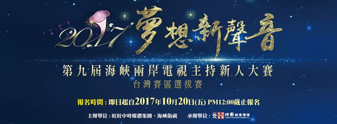 海峽兩岸電視主持新人大賽徵選活動是由旺旺中時媒體集團以及海峽衛視合作舉辦,今年第九屆的主題訂為「夢想新聲音」。只要是18至28歲,對主持表演有興趣的人都可報名參加。台灣賽區選拔賽將在台灣選出3位台灣區代表,10月20日截止報名,入圍者能獲得1萬元的獎金,以及前往福州參加總決賽的資格和機票,隨後即轉往福州和中國大陸學生菁英PK,競逐最亮眼的主持新秀!主辦單位歡迎對主持充滿嚮往,對說話的藝術充滿自信的同學踴躍報名。