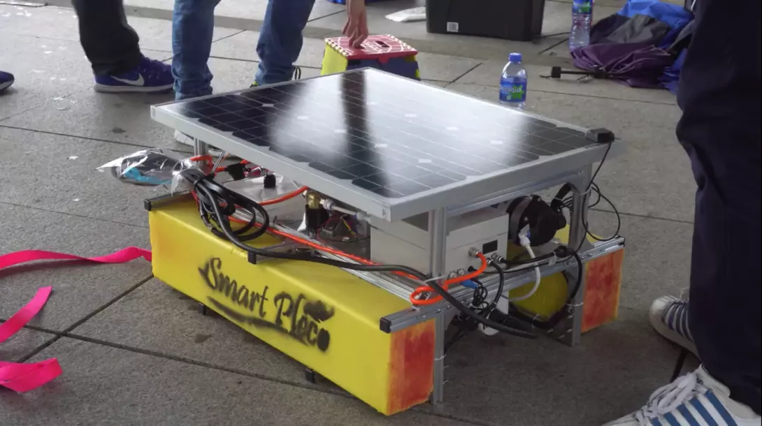 小組上課中,他們了解到藍藻、紅潮等爆發,是環境污染而導致的。何旻駿說,「我們希望可以做一個工具監測水質,阻止嚴重污染爆發。」他同時也學習了3D設計課程,利用己身所學新技術,負責主要的零件設計。三人小組將自己設計的機器無人船取名為「SMART PLECO(清道夫魚,即垃圾魚)」,寓意是機器無人船能像垃圾魚一樣,清理水中的污染。