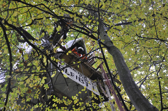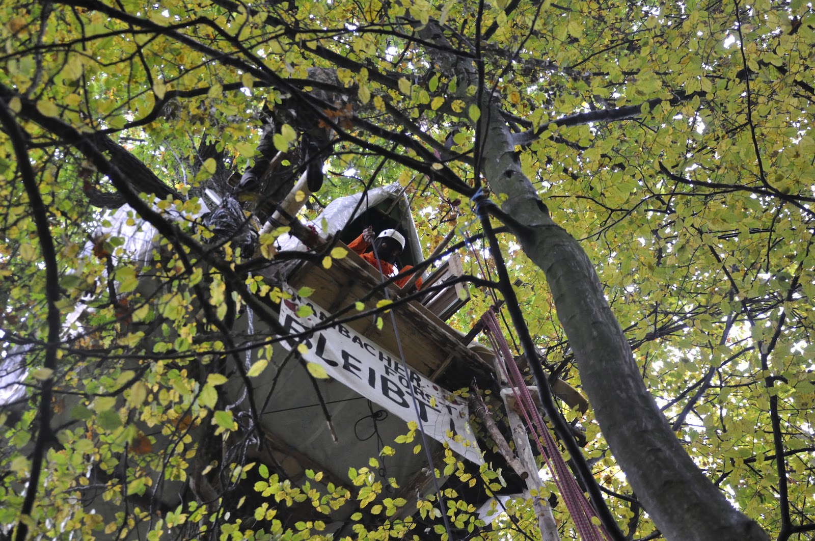 大部分人在樹上蓋樹屋住在裡面。他們堵住道路、挖壕溝,把手銬在樹幹上、躲在隧道裡,就為了保護棲息著珍稀物種,卻不斷因為褐煤礦擴張而被砍伐的森林。