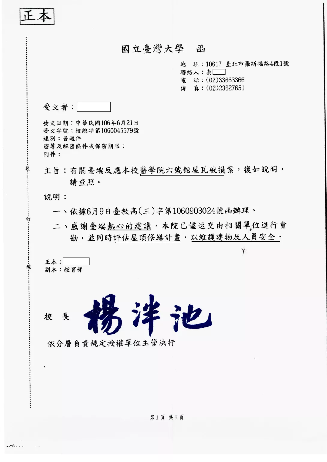 台大的回函已八個月還在[評估屋頂修繕計畫,以維護建物及人員安全!?]