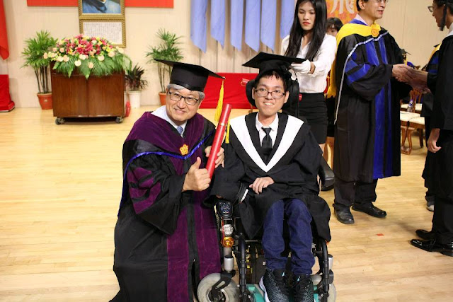 另一位則是大學部數學系畢業生陳毅,從小罹患肌肉萎縮症,自高雄中學畢業後考進高師大數學系,每天搭乘復康巴士上下學,從來不缺課,並和同學們一起參與學校各種活動,積極上進,克服先天限制,並於104年獲得教育部大專校院特殊教育學生獎助學金,以其堅毅不撓精神獲得「數學系」學士學位,值得學弟妹效法學習。