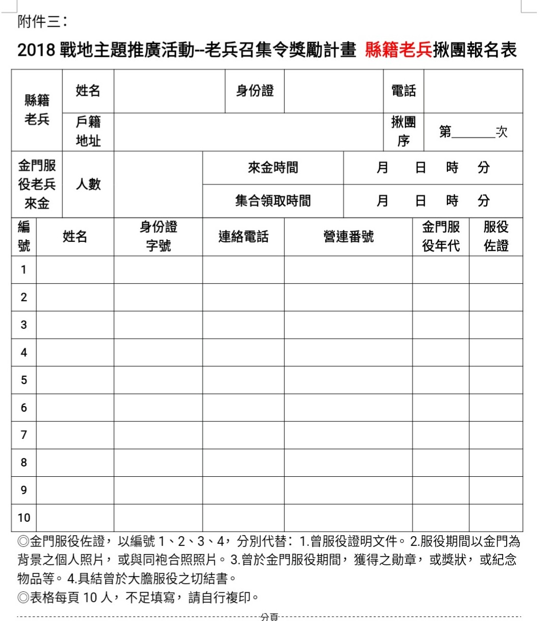 (1)請填寫「2018戰地主題推廣活動-老兵召集令獎勵計畫 縣籍老兵揪團報名表」及相關文件上傳。
