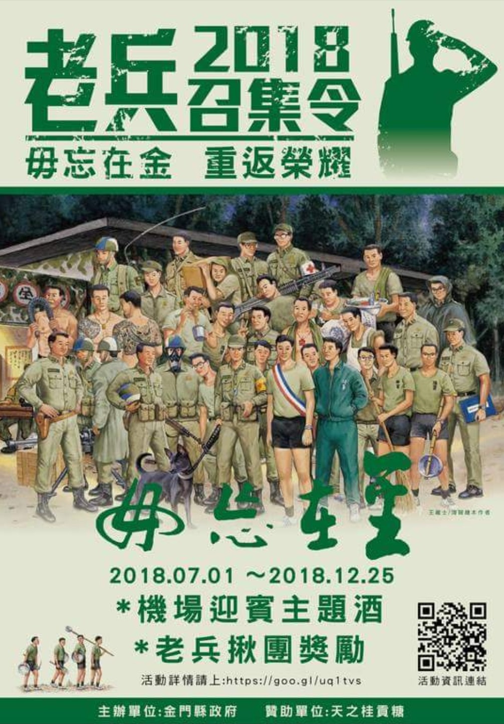金門縣政府觀光處表示,獎勵時間自107年7月1日起至107年12月25日止,獎勵對象以曾經在金門服役者,並提供下列佐證文物或文件其一,包括「曾服役證明文件」、「服役期間以金門為背景之個人照片,或與同袍合照照片」、「曾於金門服役期間,獲得之勛章,或獎狀,或紀念物品等」、「具結曾於金門服役之切結書」。