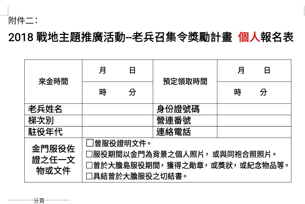 (1)請填寫「2018戰地主題推廣活動-老兵召集令獎勵計畫 個人報名表」及相關文件上傳。