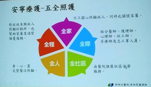 吳俐雯護理師指出,安寧療護的「五全照顧」,包括有全人(提供病人身、心、靈全面照顧)、全程(從開始到病人往生後)、全家(以病人和家屬為照顧中心)、全隊(專業的醫療團隊,照顧病人和家屬的身、心、靈需求)、全社區(由醫院推展社區安寧服務)。