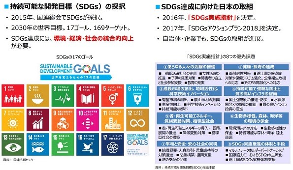 這次新發表的環境白皮書,日本指出了兩個朝向永續社會的典範轉移概念,首先是以聯合國發佈的2030年世界永續發展目標(SDGs)為主,打算整合社會、經濟、環境三大框架,加速日本在17項SDGs方面的落實進度,制訂了許多報告文本及行動計畫,而且企圖融合民間企業與自治團體的力量。