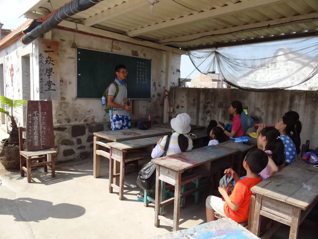 黃啟翔在二崁聚落裡與團員一起感受以前的人學習的場所,並且分享在地的吟唱-褒歌。 圖片提供/共生藻旅行社