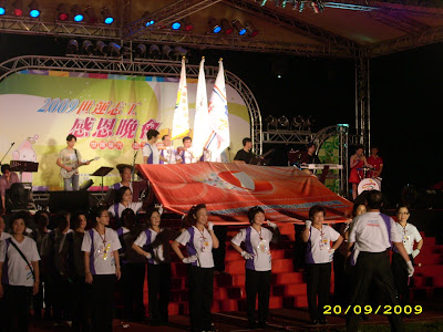 2009世界運動會組織委員會(KOC)二十日下午五點,在高雄市立中正運動場舉辦「2009世運志工感恩晚會」,會中除了頒發志工榮譽狀及獎章之外,也頒發感謝狀給各個參與世運的機關學校及民間團體,陳菊市長再次感謝四千多位志工及所有參與世運的工作同仁、市民朋友們的付出與努力,還特別破例高歌一曲《朋友》呼籲志工們的愛還要延續下去。