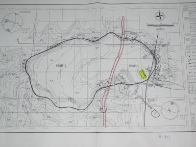 (圖中是永揚預定地,右方黑色線即北勢坑斷層通過線。研判「主斷層帶」約在斷層線周圍9米寬。稍左邊兩條紅線範圍內即「緊鄰斷層的破碎帶」,直切過場址,約11米寬。)