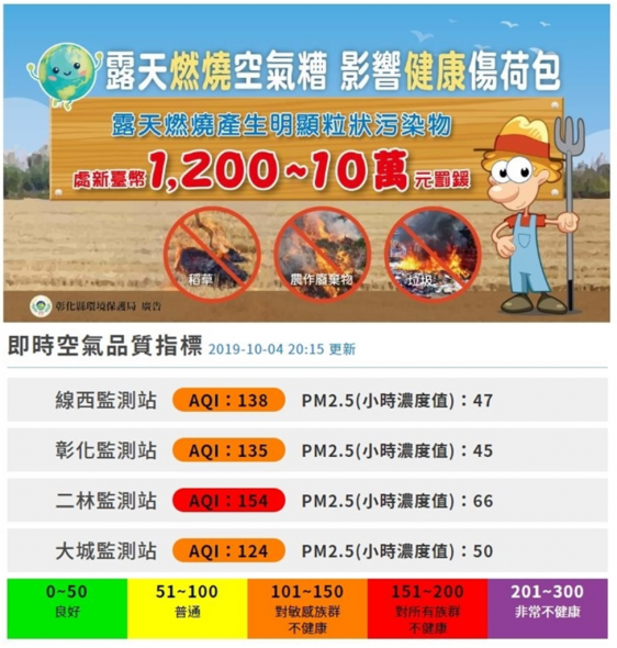 根據彰化縣環保局網站即時空氣品質指標資料顯示,4日直到晚上8點15分,汙染還沒有擴散,彰化縣「二林監測站」AQI仍達到154,對所有族群不健康,其餘「線西監測站」、「彰化監測站」、「大城監測站」仍呈現橘色警戒,敏感族群應減少在戶外劇烈活動。